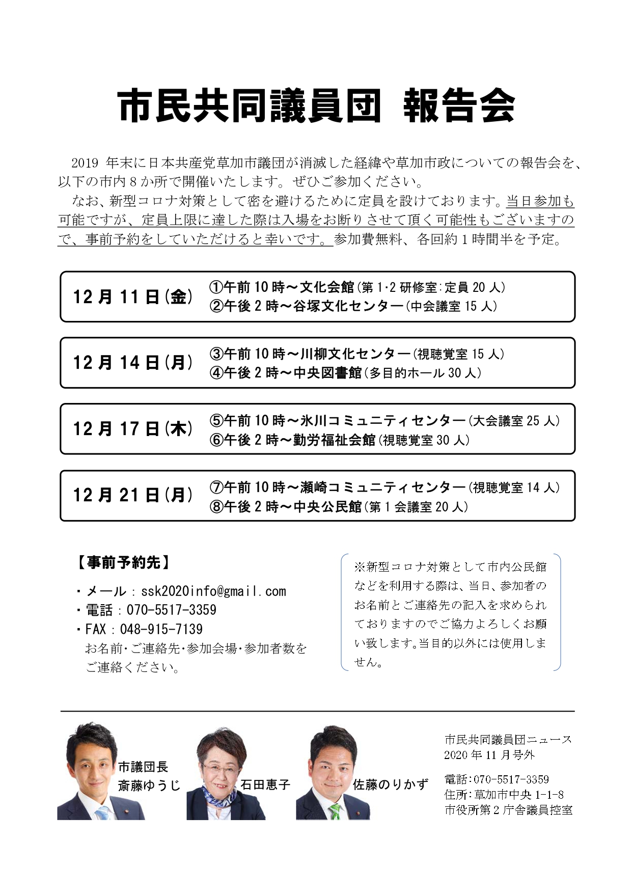 議会報告市民共同議員団 報告会を開きます 2019 年末に日本共産党草加市議団が消滅した経緯や草加市政についての報告会を、以下の市内 8 か所で開催いたします。ぜひご参加ください。なお、新型コロナ対策として密を避けるために定員を設けております。当日参加も可能ですが、定員上限に達し...2020.12.08議会報告